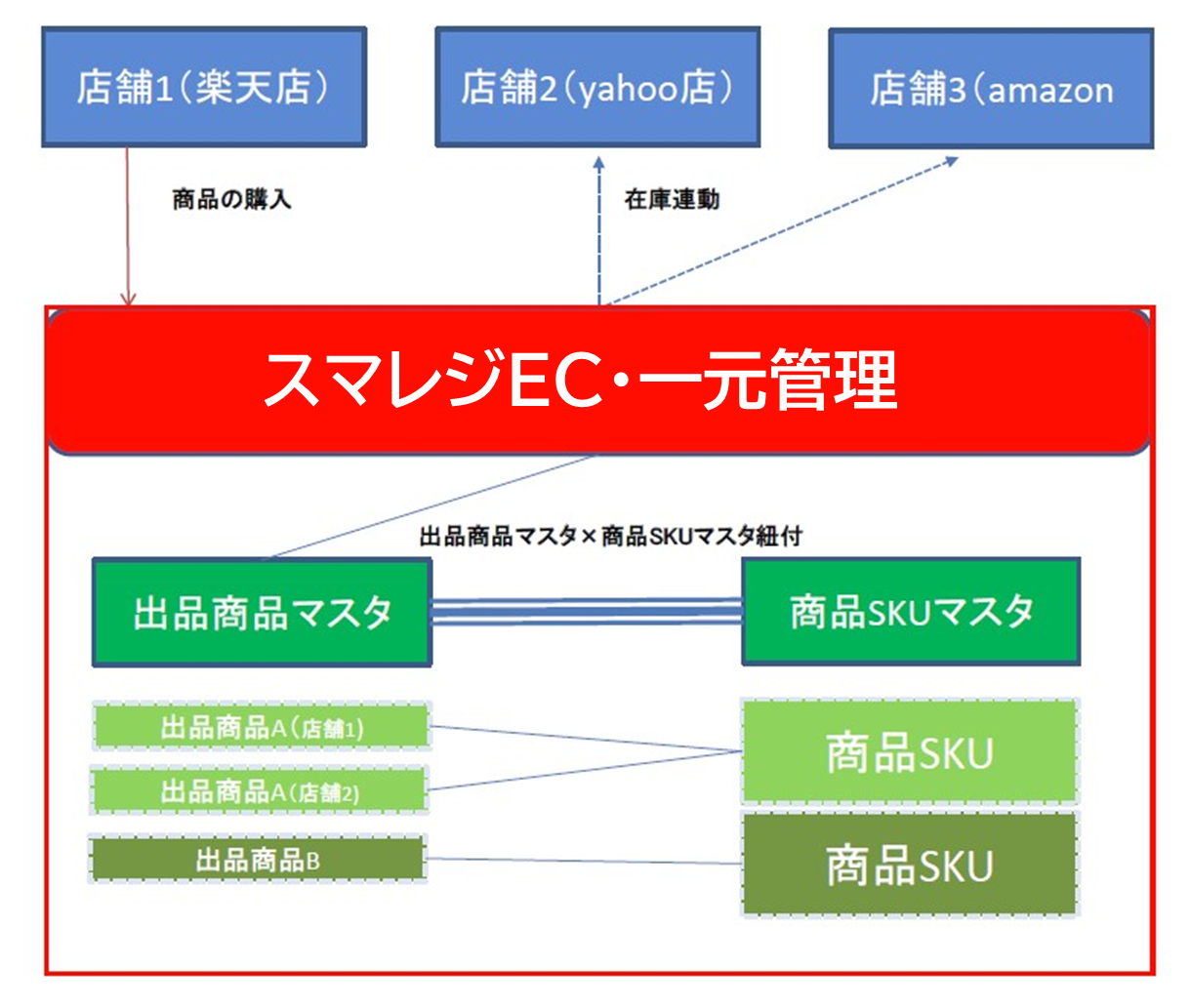 各モールの出品商品情報に相違があったとしても、スマレジEC・一元管理側では1つの出品商品として扱うことが可能となり、それによりモール側の情報を合わせることなく(モールの出品情報の修正不要)、在庫管理が可能となります。