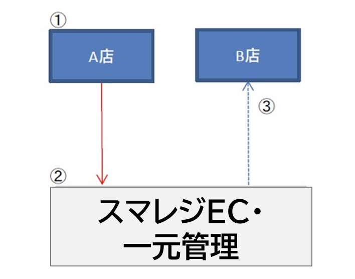 例えば以下の図のように、モール1で商品を購入された場合、他モールの在庫数も1つ減らし自動的に在庫数を調整します。
