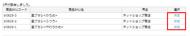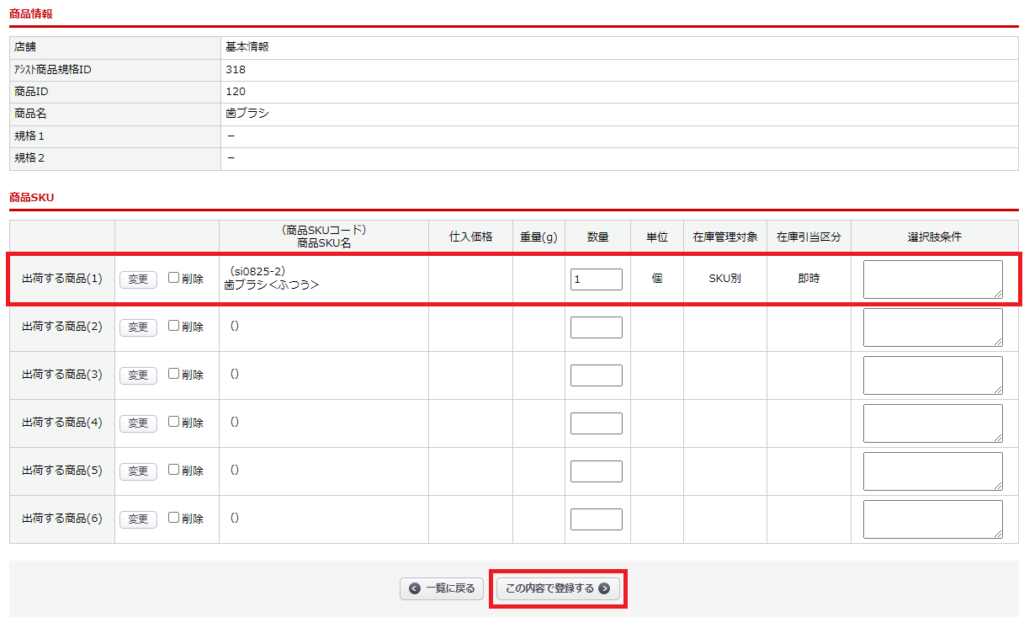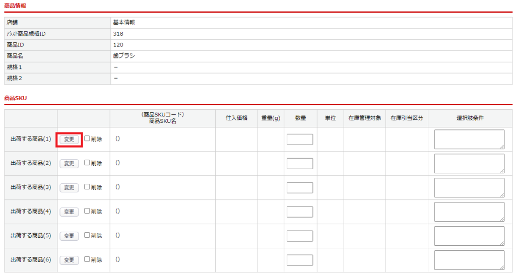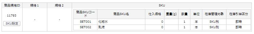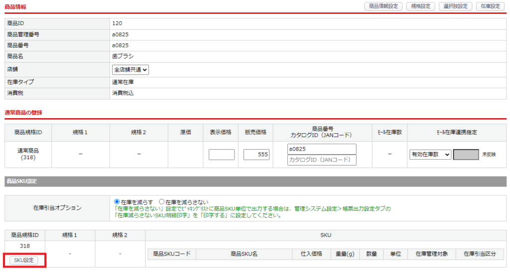 出品商品マスタ×SKU紐付け画面にて出品商品毎に設定を行う。