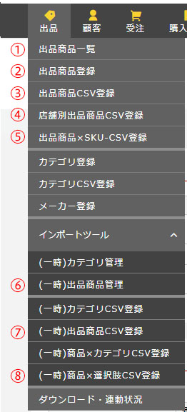 - 各モールよりダウンロードしたCSVファイルでの出品商品マスタ登録 (例)RSMのファイル名:Item.csvを使用
