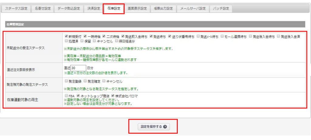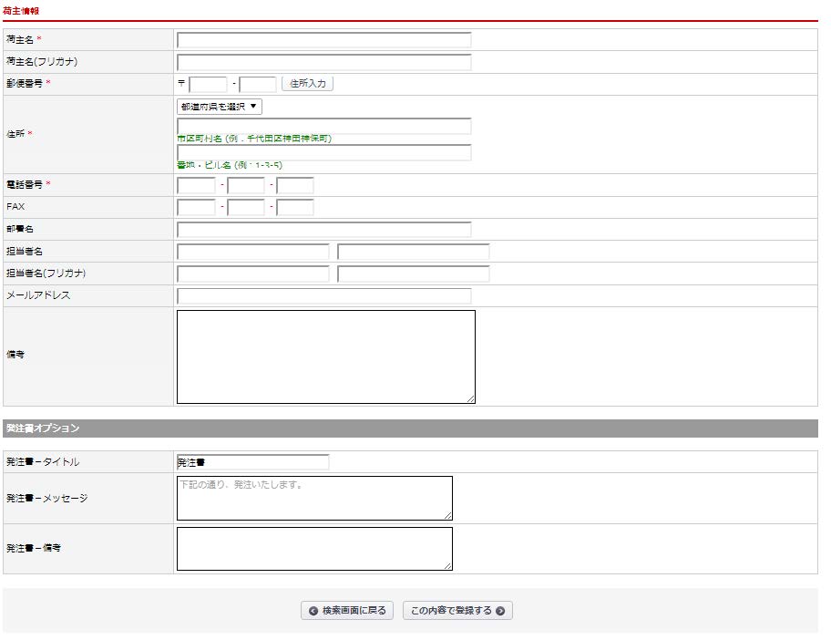 荷主:登録済み荷主から該当の荷主を選択する *荷主設定なしの場合、在庫管理が行えなくなる。