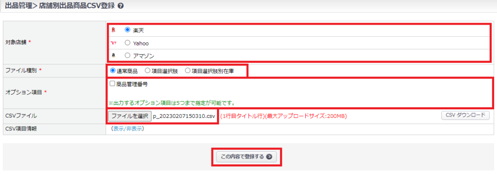 - 各モールよりダウンロードした、規格用CSVファイルでの、出品商品マスタ登録 (例)RSMファイル名:select.csvを使用