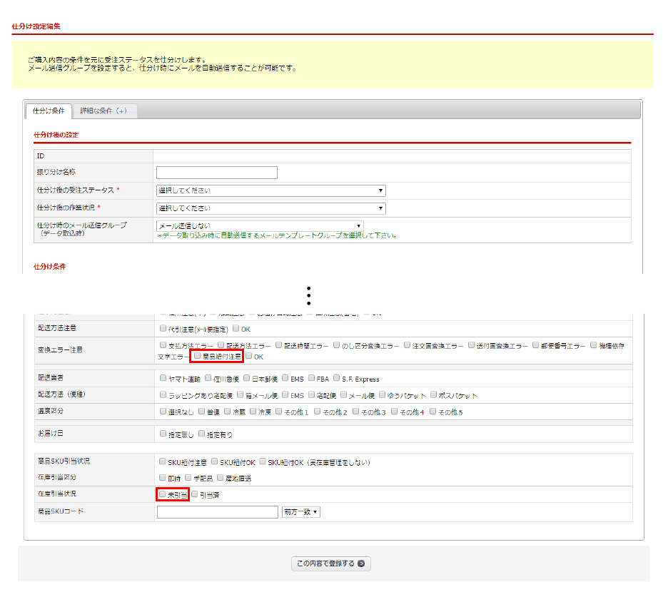 ①の場合の仕分け条件 在庫引当状況 : 未引当