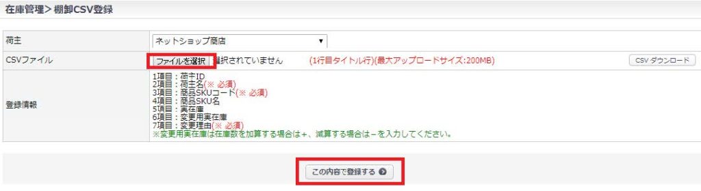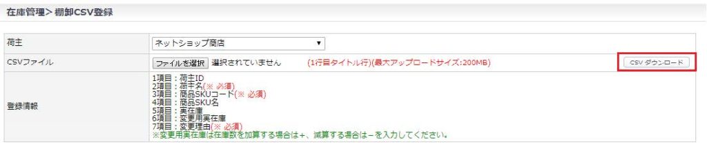 1)在庫>棚卸CSV登録より棚卸しCSVテンプレートのダウンロードを実施する。