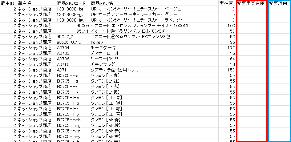 2)以下の赤枠部「変更用実在庫」に棚卸しで実在庫からの増減を記載する。