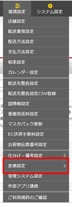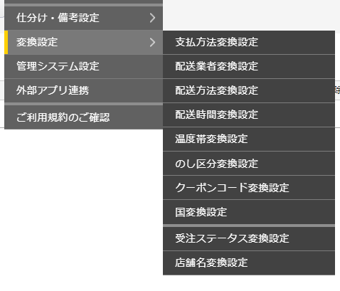 | 配送方法変換設定 | 配送方法の変換設定について、新規登録・編集・削除を行います。 |
