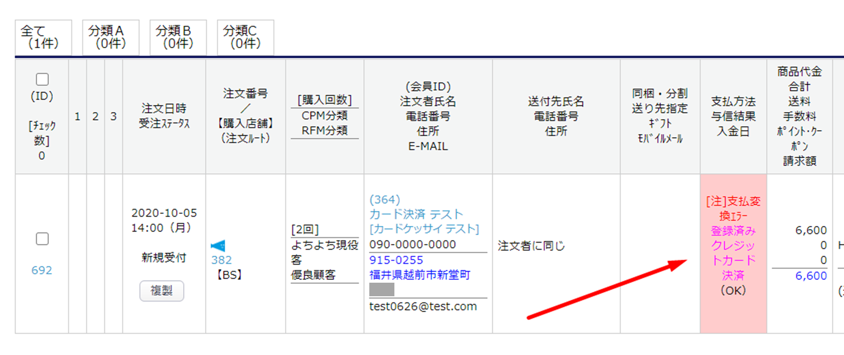 今回のケースでは、支払方法「登録済みクレジットカード」の受注が取り込まれた際に