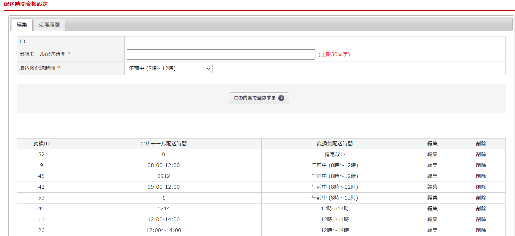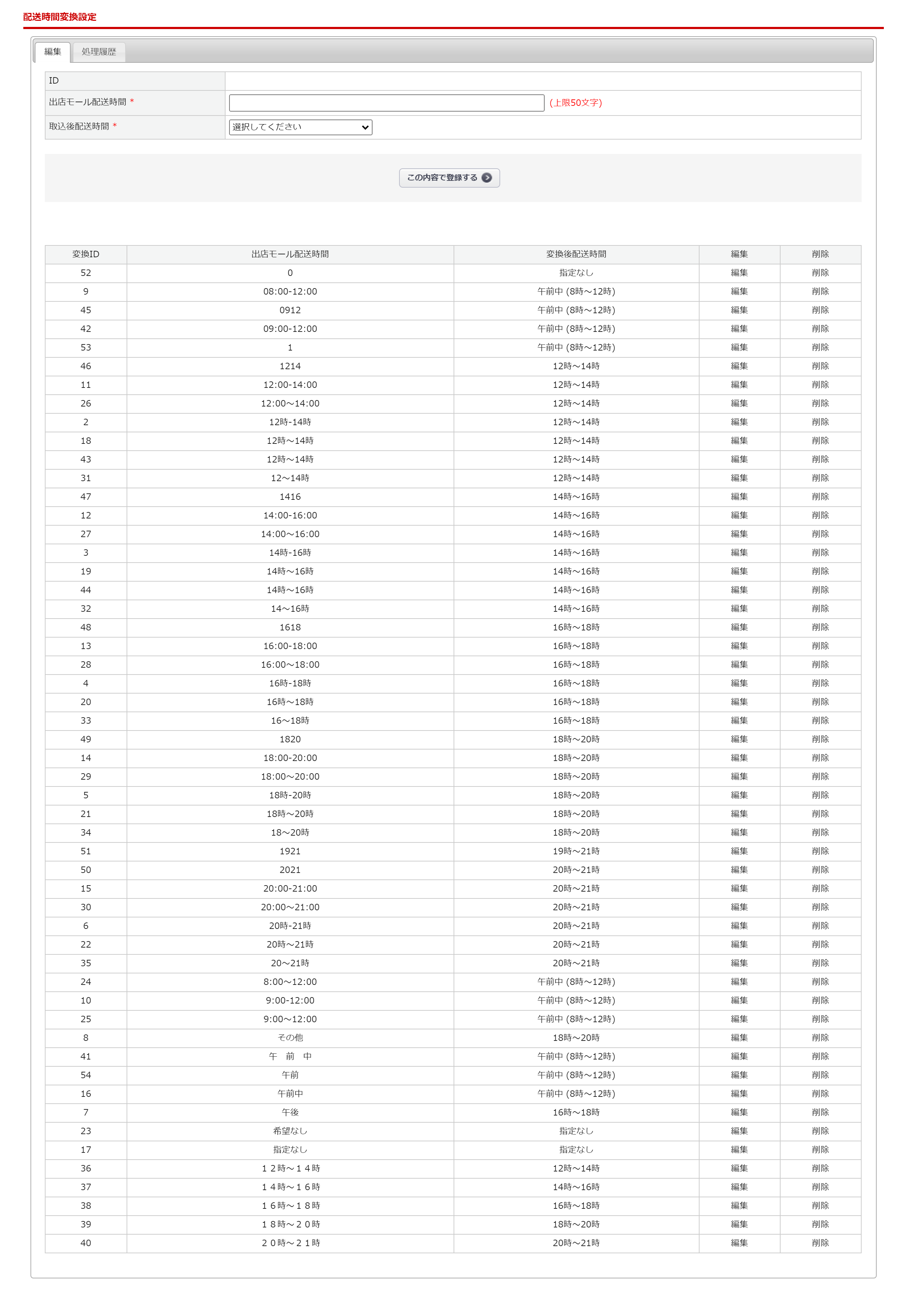 配送時間の変換設定について、新規登録・編集・削除を行います。