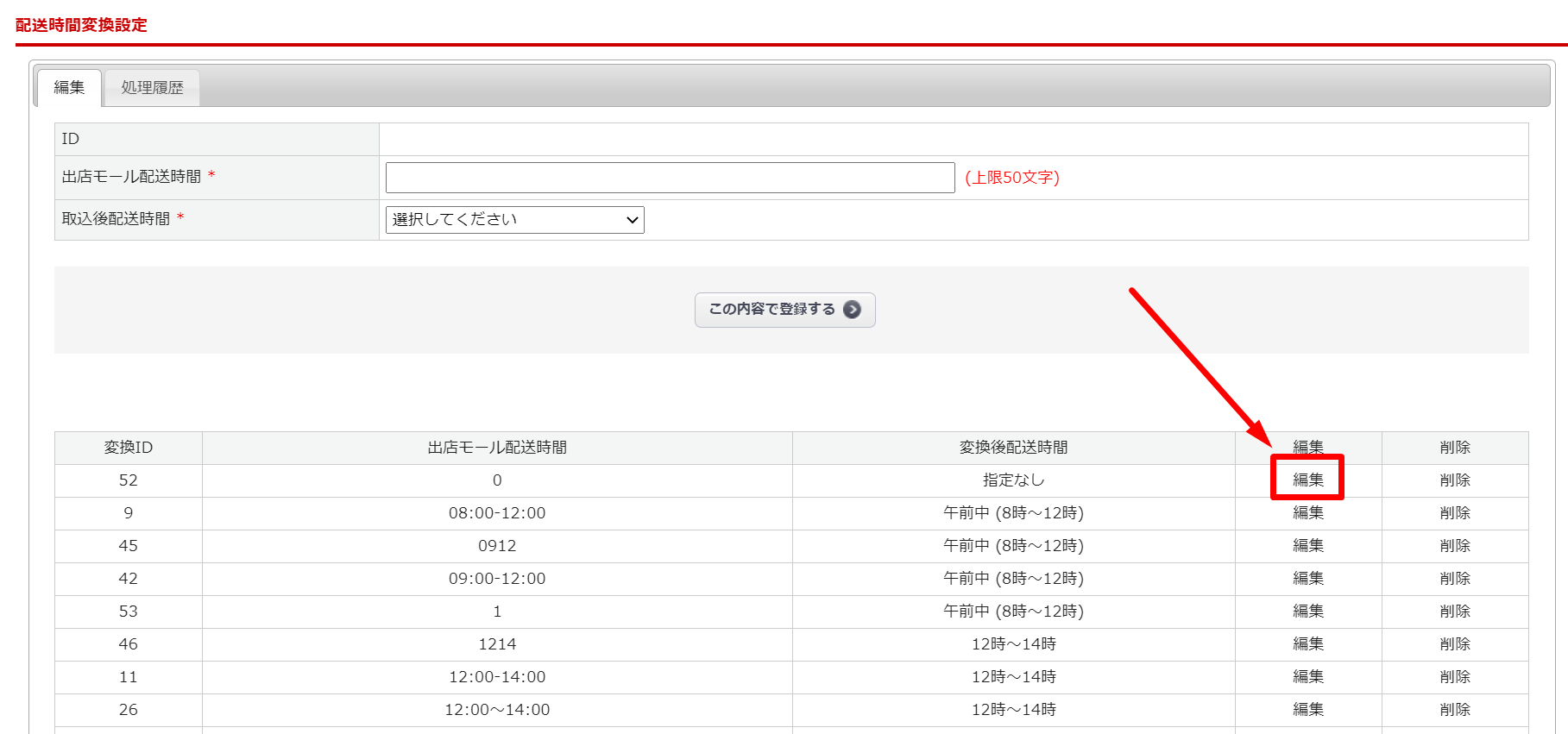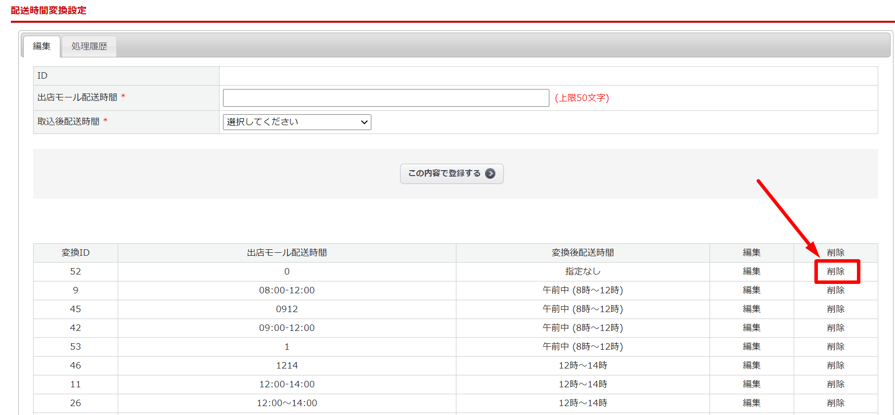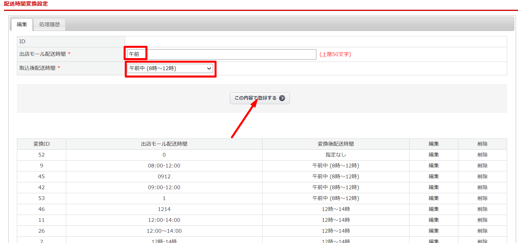 「出店モール配送時間」「変換後配送時間」をそれぞれ入力・指定し、