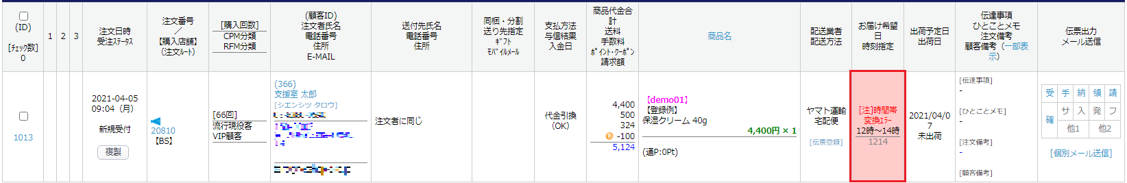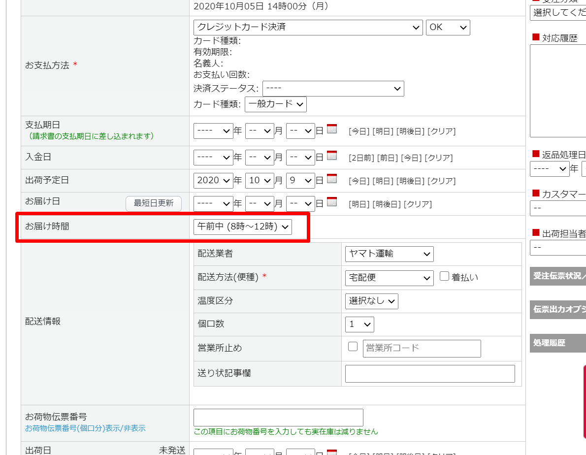 受注管理>受注登録>詳細情報 配送情報「お届け時間」欄の内容が受注取込時に変換されます。