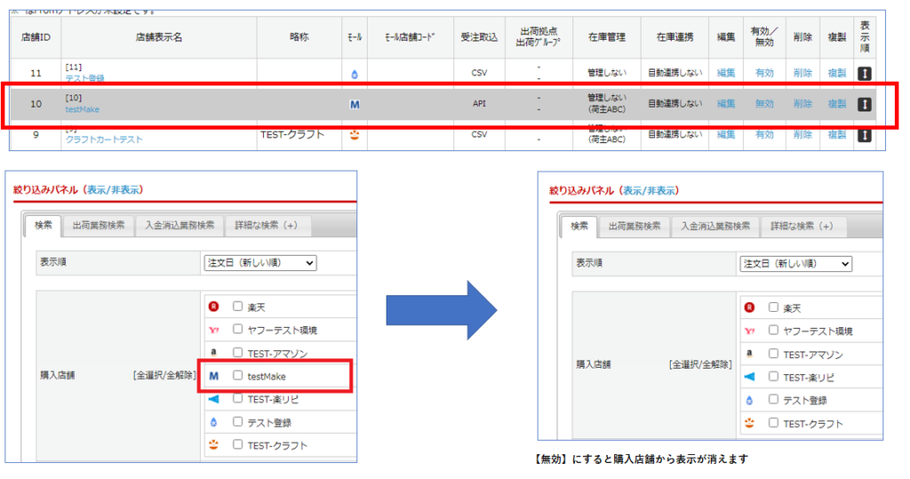 ・店舗設定を「有効」から「無効」に変更すると、受注一覧や分析機能で店舗名を指定した絞り込みができなくなります。