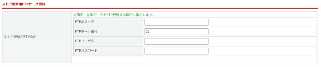 商品・在庫データをFTPで更新する際に必要となるFTPサーバの情報を登録します。