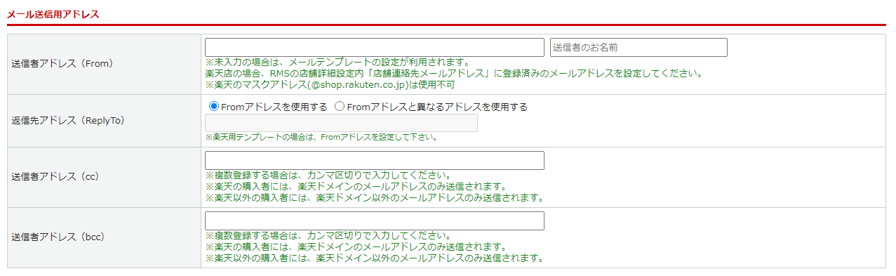 | 送信者アドレス(From)* | ユーザーにメールを送信する際のメールアドレスを設定します。 右欄にて送信者のお名前も指定可能です。 楽天店の場合、RMSの店舗詳細設定内「店舗連絡先メールアドレス」に登録済みのメールアドレスを設定してください。 ※楽天のマスクアドレス(@shop.rakuten.co.jp)は使用不可です。 ※Amazon店、Qoo10店は入力必須ではありません。 ※SPFレコードが設定できないドメインはご利用できません。(楽天店、Amazon店、Qoo10店を除く) |