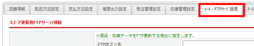 在庫連動(SKU在庫管理)機能をご利用の場合、タブ名は以下の通り【メール・FTPサーバ設定】となり、