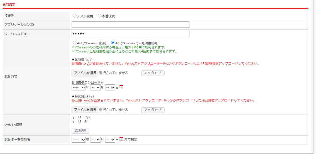 接続先[本番環境]を選択し、モール側からのAPI情報をもとにIDやパスワード等を入力してください。
