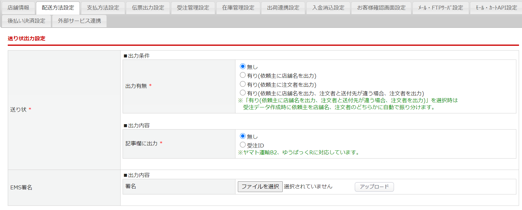- 送り状CSVのお客様管理番号として受注IDを出力するかどうかを設定します。