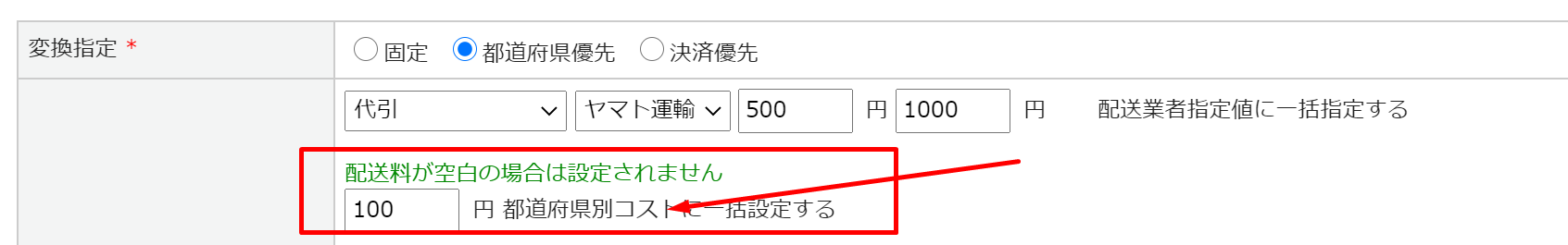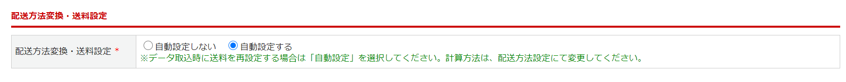 変換設定を利用する場合、「配送方法変換送料設定*」 →「自動設定する」を選択してください。