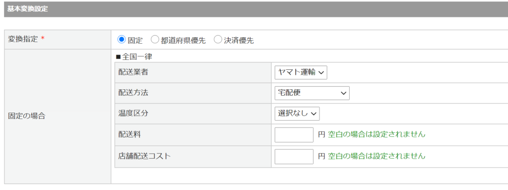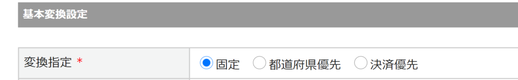 ①基本変換設定 :「固定」or「都道府県優先」or「決済優先」より選択します。