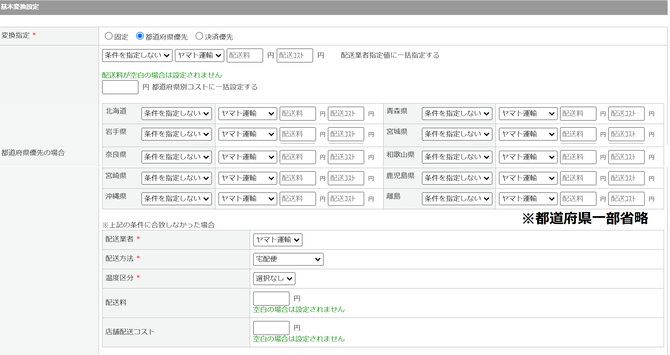 下部の設定欄では都道府県別の条件に合致しなかった場合の変換内容を設定できます。