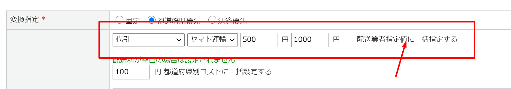 上部の欄に設定を入力後、「配送業者指定値に一括指定する」をクリックすることで、