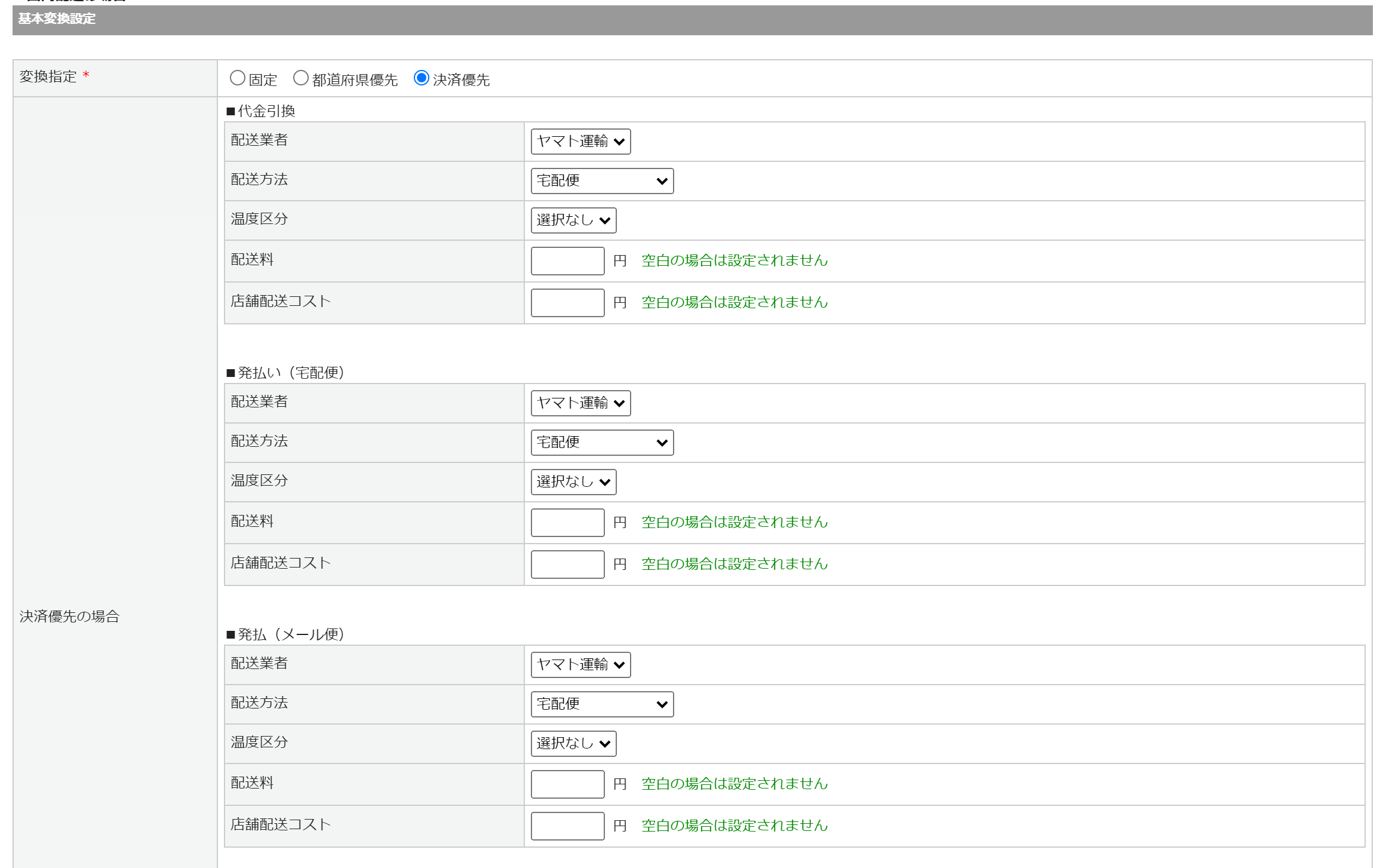 ・配送業者が2社以上の場合 →「都道府県優先」「決済優先」どちらかを選択します。