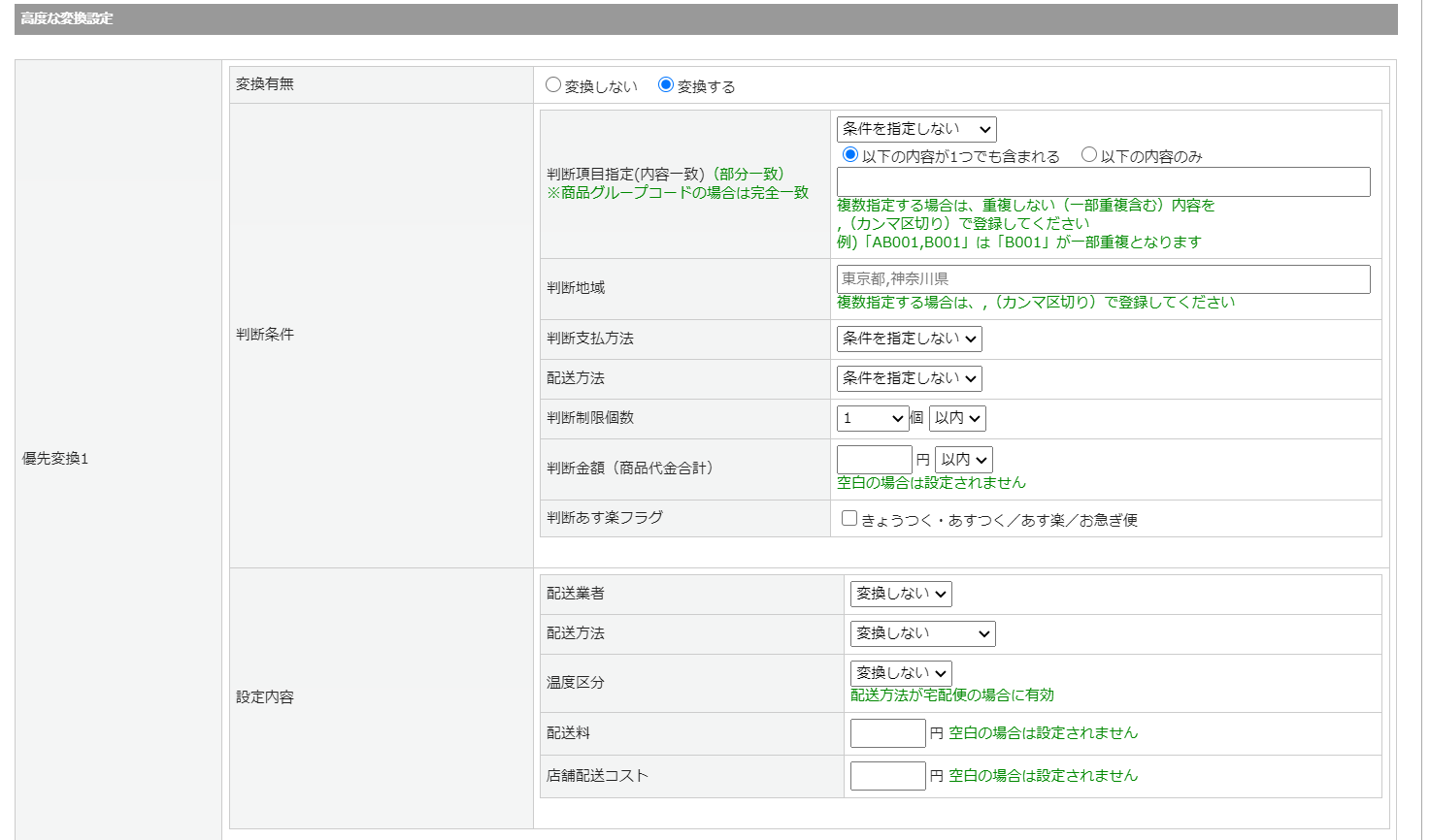 更に個別で配送情報を変換する場合、優先変換の判断条件を最大10通り設定できます。