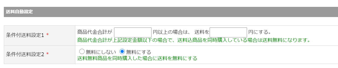 商品代金合計による送料変更や、送料無料商品を同時に購入した時の送料を設定します。