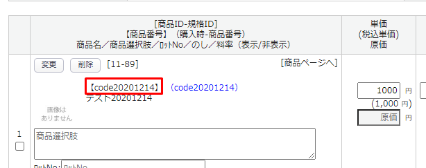 ・受注明細に表示されている商品番号(商品コード)を、”品名コード”に出力します。