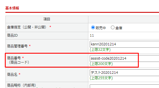 ・出品商品登録で登録されている商品番号(商品コード)を、”品名コード”に出力します。