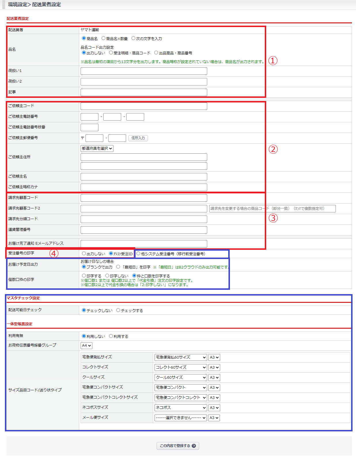 ※お荷物伝票番号取込時のキー項目となるため、「アシスト受注ID」を選択してください。 - 【この内容で登録する】ボタンをクリックします。