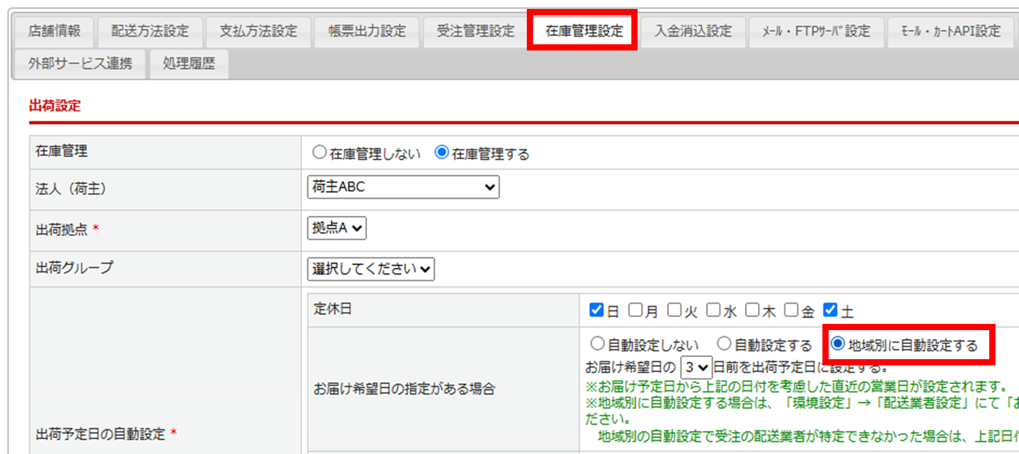 - 「お届け希望日の指定がある場合」で「地域別に自動設定する」を選択する