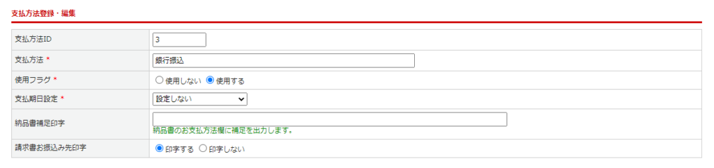 | 支払方法* | 支払い方法の名称を入力してください。 設定した名称が受注の支払方法として表示されます。 |