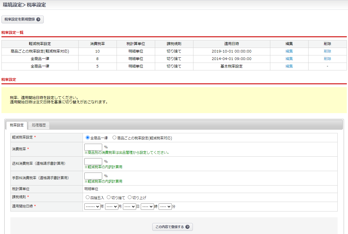 環境設定>税率設定 公開日 : 2021年8月24日 / 更新日 : 2025年12月11日 環境設定 設定方法 税率の設定です。稼働時に初期値として最新の税率が設定されています。 ※2019年10月からの消費税改正に伴い、全ての店舗様で対応が必要となります。詳細はこちらのページをご確認ください。 設定画面 環境設定>税率設定 詳しい設定方法はこちら この記事で解決しましたか? 〇 はい 0 × いいえ 0 「環境設定>配送先警告設定」 「環境設定>店舗設定>出荷管理設定」