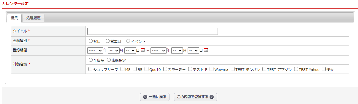 登録種別 | 祝日:臨時休業など、休業する日を設定する場合に選択 営業日: 定休日(※)やカレンダー設定に登録されている祝日に営業する場合、 「営業日」を選択する ※環境設定>店舗設定>「出荷管理設定」タブにて登録されている定休日 イベント:イベント日として設定 |