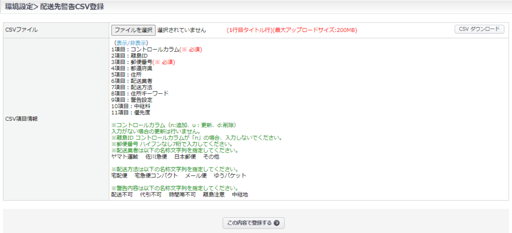 ※右上の【CSVダウンロード】ボタンは、現段階で配送先警告設定に登録されている配送先をCSVファイルでダウンロードできます。