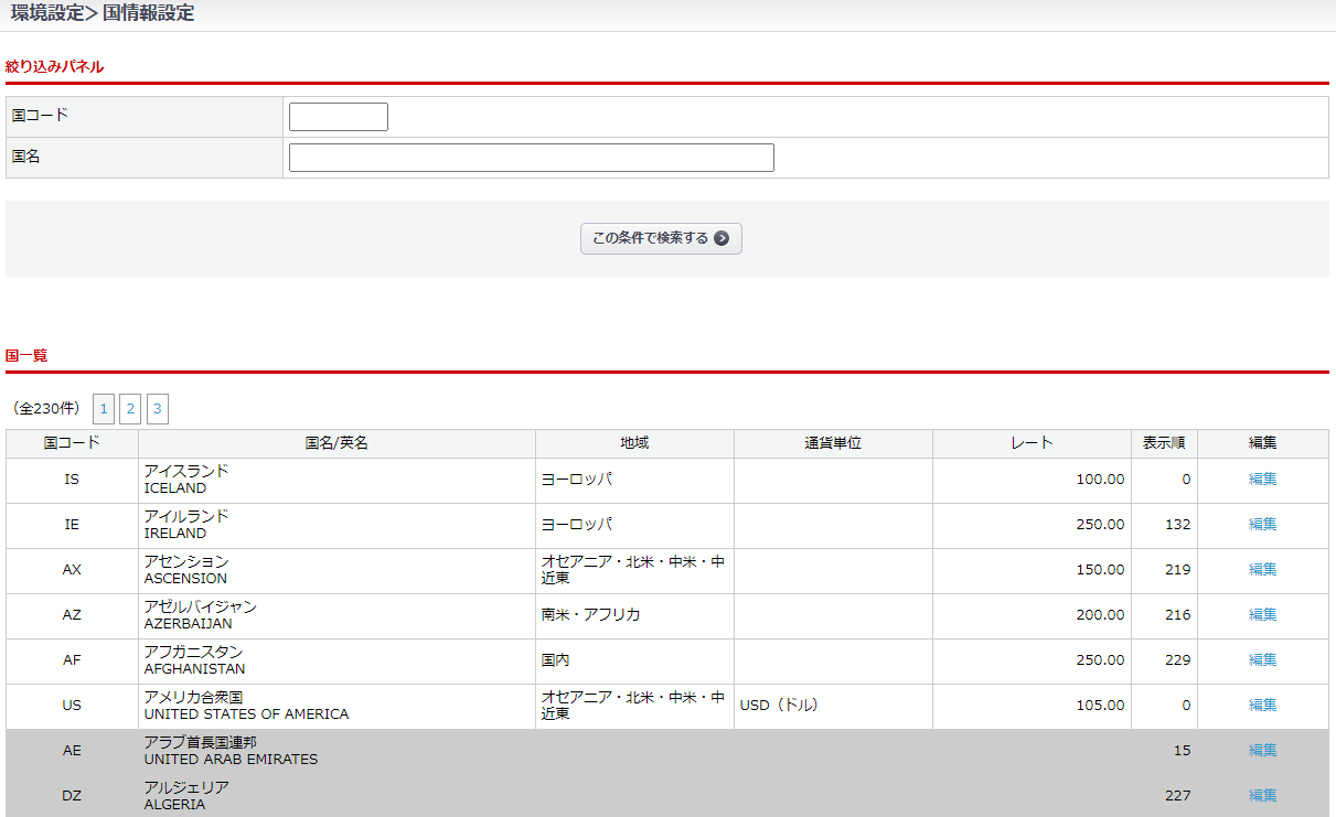 | 国名(英名) | 国名(英名)を設定できます。 ※初期設定で登録されています。 |