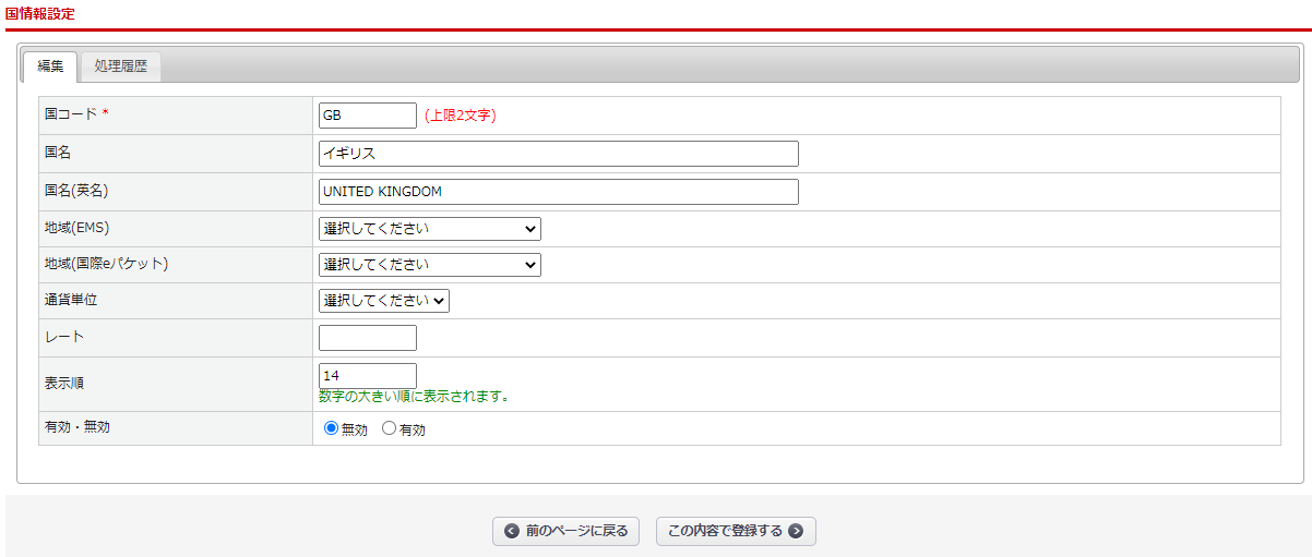 | 有効・無効 | 国情報設定の利用有無を選択できます。 「無効」を選択すると、国一覧画面でグレーアウトで表示されます。 |