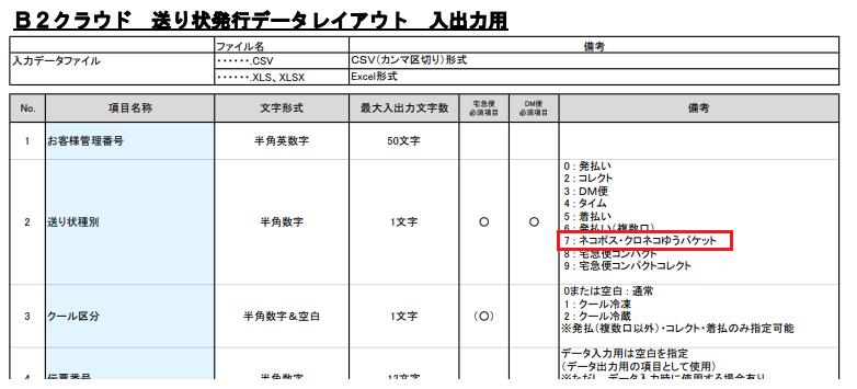 B2クラウドの送り状種別は、「7:ネコポス・クロネコゆうパケット」になります。
