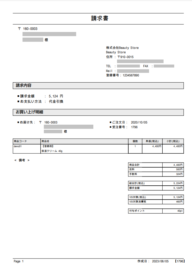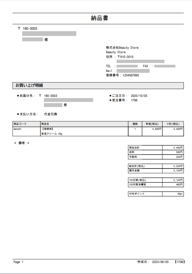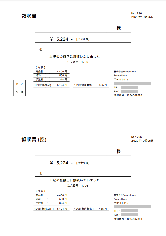 • 納品書・領収書・請求書のタイトルについて、MYページの購入履歴詳細に表示される出力ボタンの名称もこちらで設定したタイトルの表記になります。