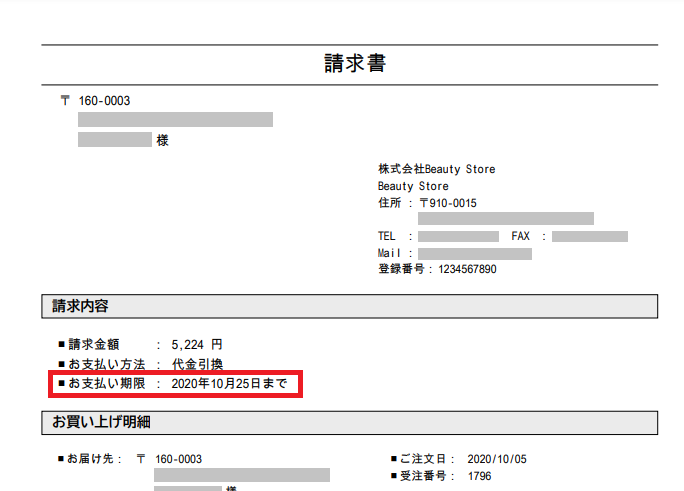 伝票出力オプションの請求書欄に「{支払期日}」タグを追加すると請求書内に支払期日が表示されます。