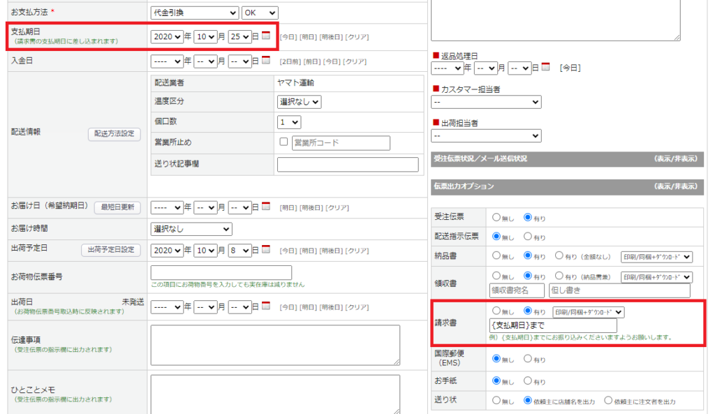 伝票出力オプションの請求書欄に「{支払期日}まで」と入力