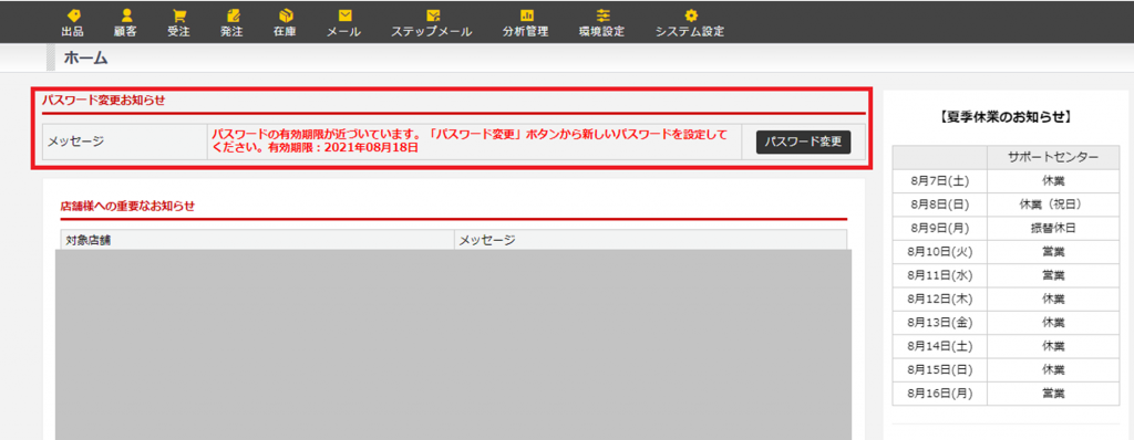 HOME画面への警告表示を設定していて、パスワードの有効期限が近付いているユーザのHOME画面では、「パスワード変更のお知らせ」が表示されるようになります。