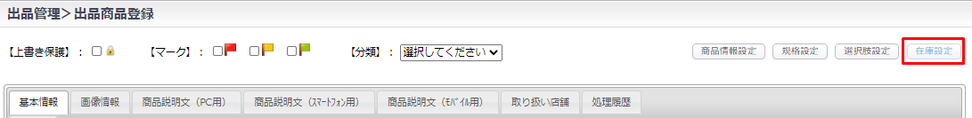 出品商品登録画面右上の【在庫設定】ボタンから設定します。