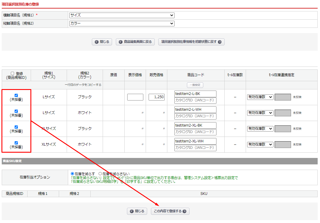 | 登録(商品規格ID) | 項目選択肢別在庫の登録前は商品規格IDは未採番となっています。 在庫登録を行いたい商品にチェックを入れて【この内容で登録する】ボタンを 押すと、商品規格IDが採番され、「商品SKU設定」に設定項目が追加されます。