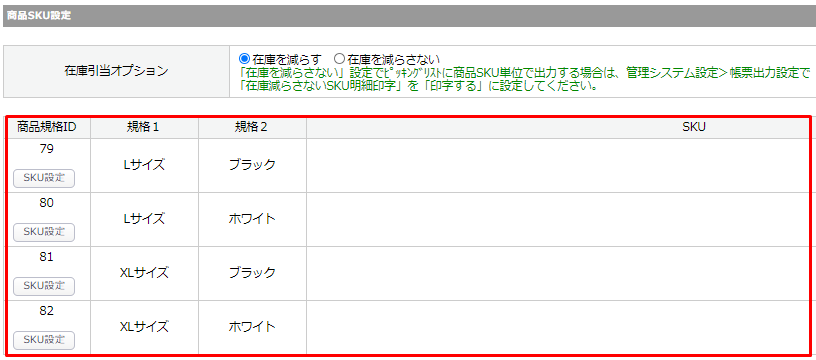 「商品規格ID」の【SKU設定】ボタンより「SKU」を設定します。 |