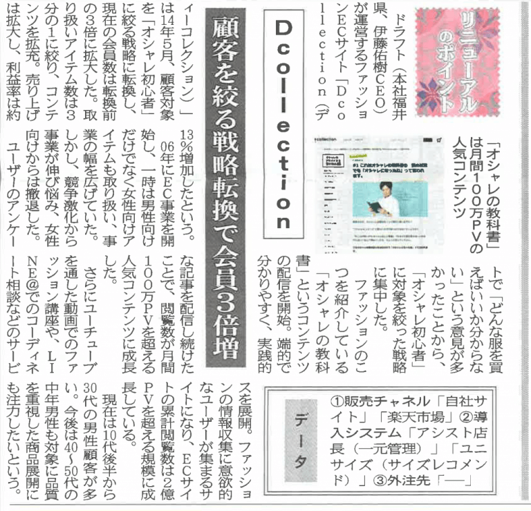 ファッションECサイト”Decollection”を運用している株式会社ドラフト様が、 日本ネット経済新聞に掲載されました。 株式が嫌ドラフト様は、一元管理システム『アシスト店長』を利活用いただいています。