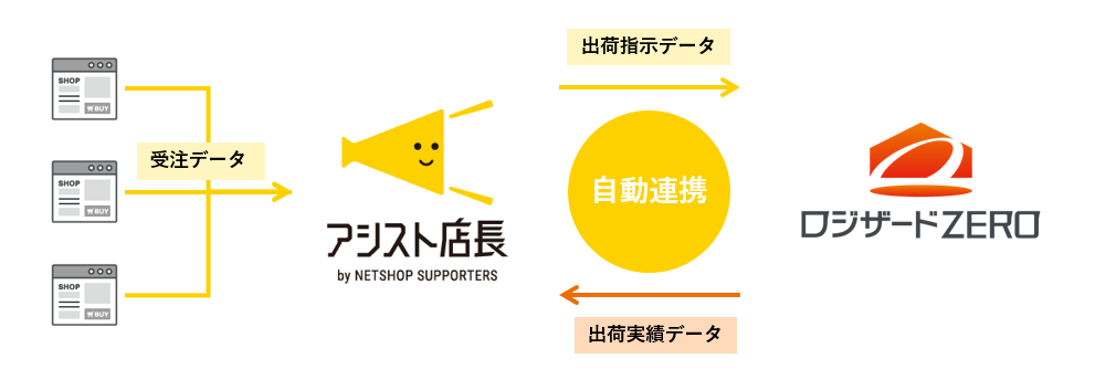 各ECサイト・モールから吸い上げた受注情報をアシスト店長で一元化、出荷指示データとしてロジザードZEROに取り込みます。ロジザードZEROにて出荷指示・お買い上げ明細書等の帳票出力・引当・ピッキング・検品を管理、梱包・出荷後に出荷実績データをアシスト店長へ返します。
