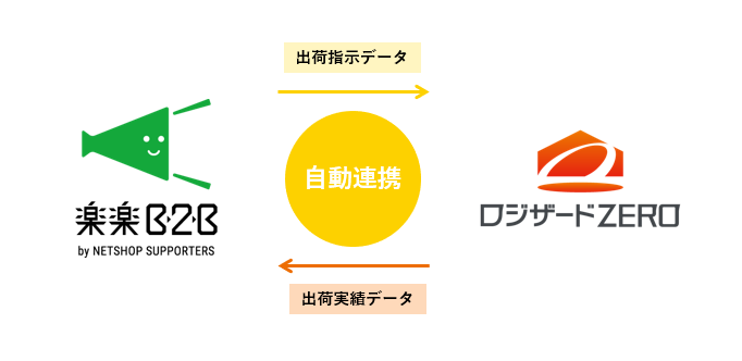 楽楽B2Bで管理する各取引先様からの発注データを、出荷指示データとしてロジザードZEROに取り込みます。ロジザードZEROにて出荷指示・お買い上げ明細書等の帳票出力・引当・ピッキング・検品を管理、梱包・出荷後に出荷実績データを楽楽B2Bへ返します。