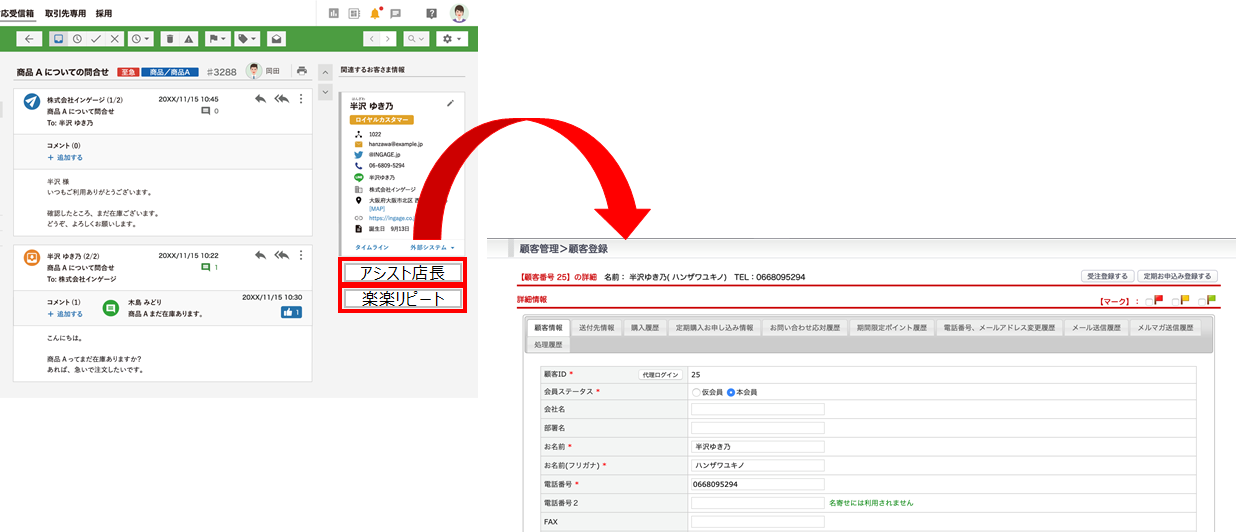 この度の連携により、Re:lationに届いたメールやチャットなどから『アシスト店長』『楽楽リピート』内の顧客情報を簡単に呼び出すことができるようになりました。