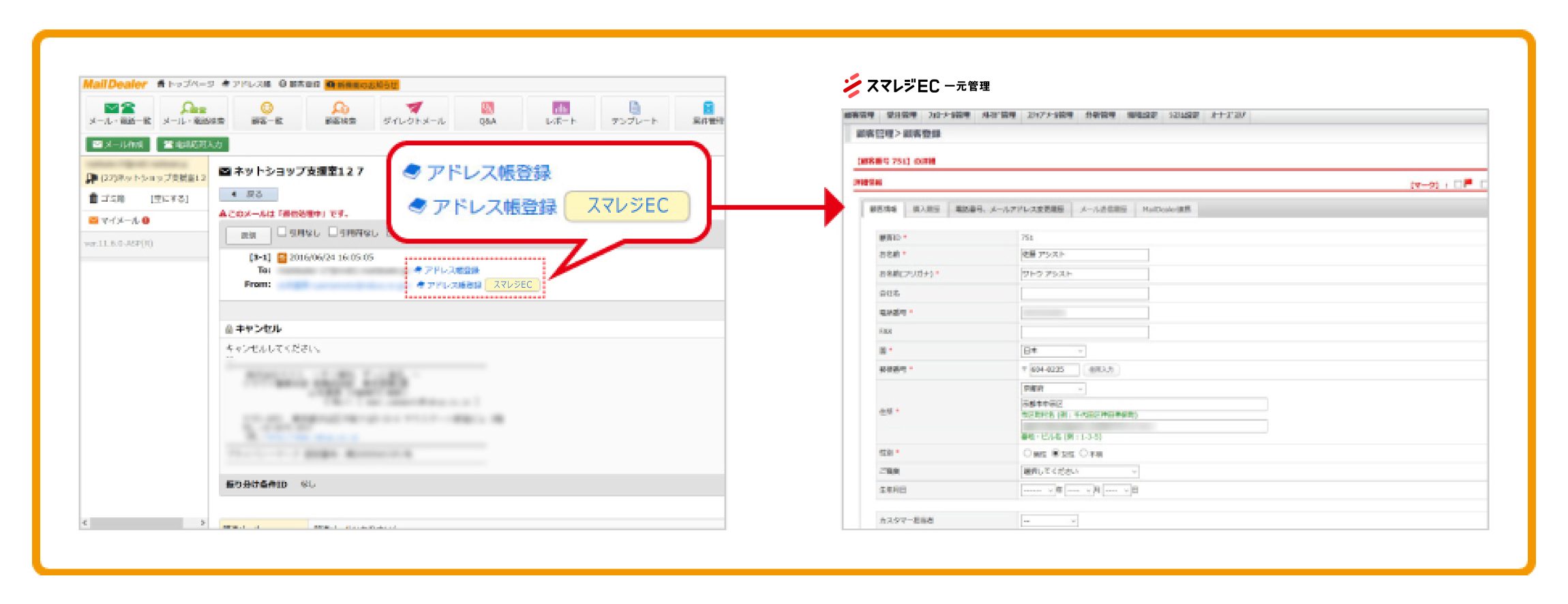 メールディーラーで受信した問い合わせメールからワンクリックでスマレジEC・一元管理の顧客情報画面を表示。 過去の受注状況がすぐに確認できます。顧客情報の修正も探す手間を省いてすぐに対応できます。